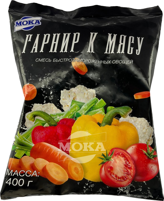Состав: капуста цветная – розочки, фасоль стручковая зелёная нарезанная, перец сладкий, морковь, томаты.